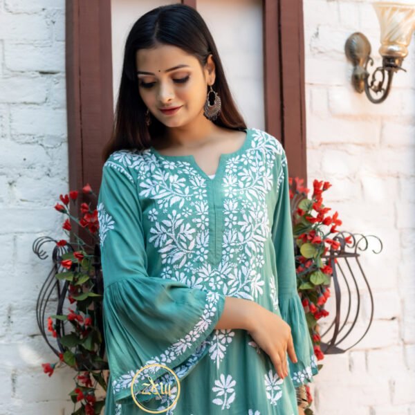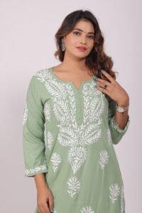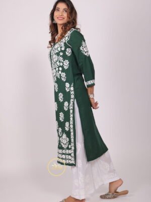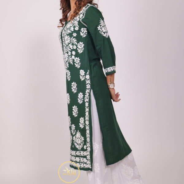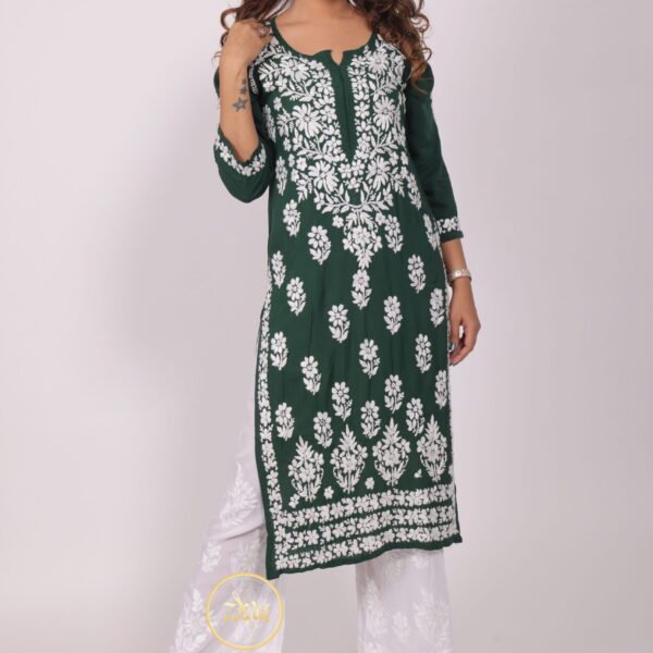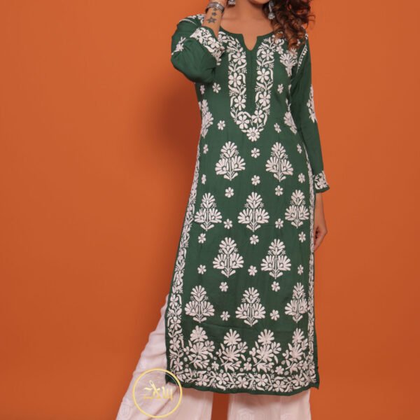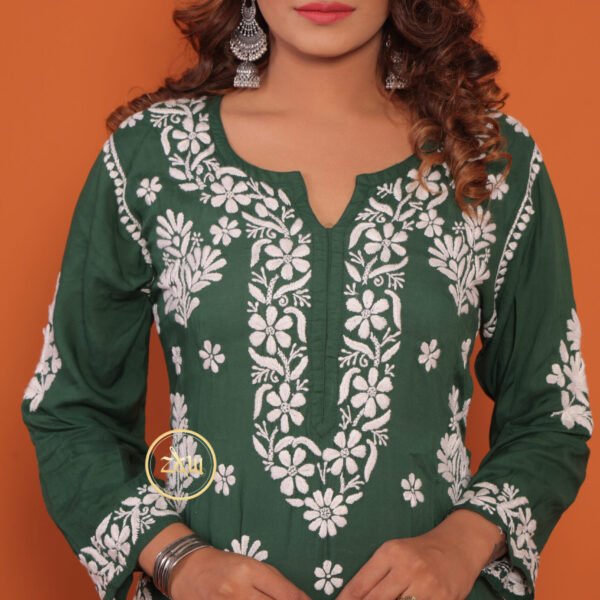 ZCW Modal Chikankari Women’s Long Kurti – Bottle Green