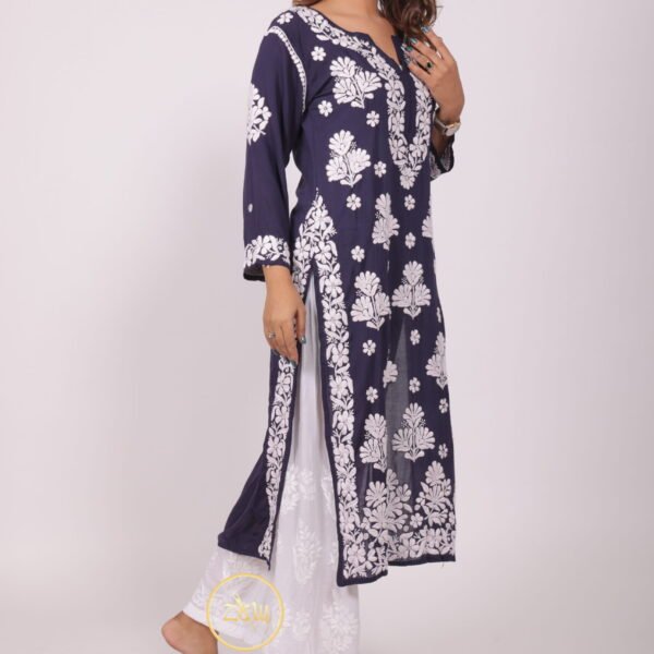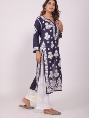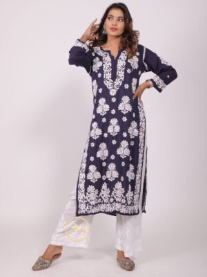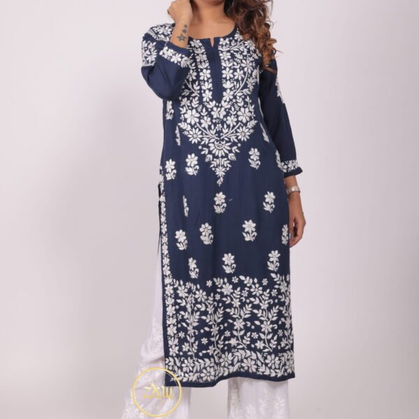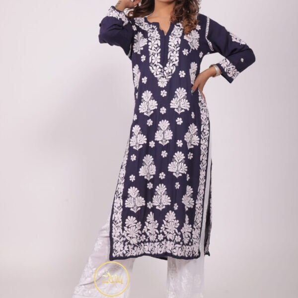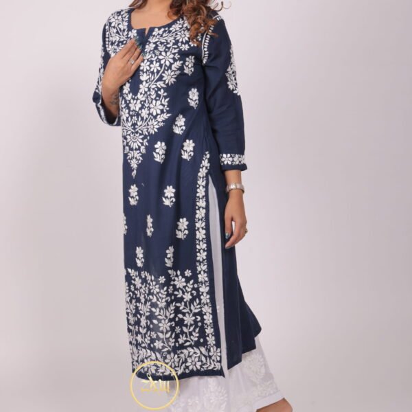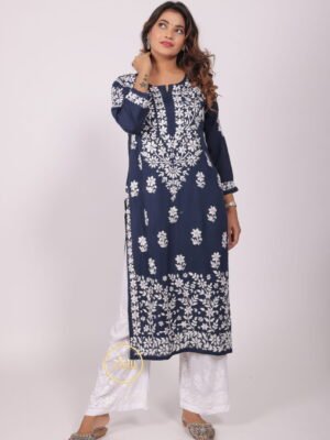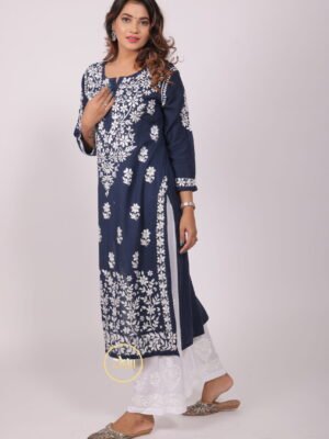 ZCW Modal Chikankari Women’s Long Kurti – Navy Blue