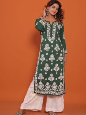 ZCW Modal Premium Chikankari Women’s Long Kurti – Bottle Green