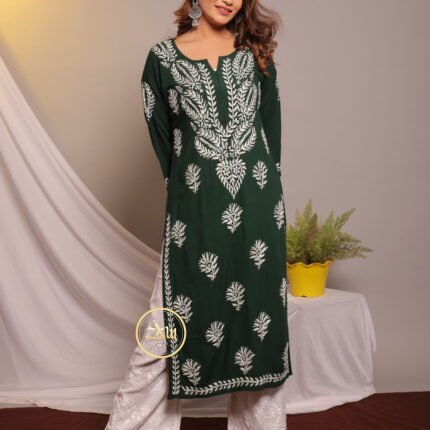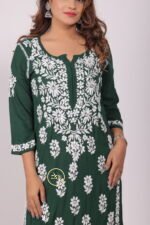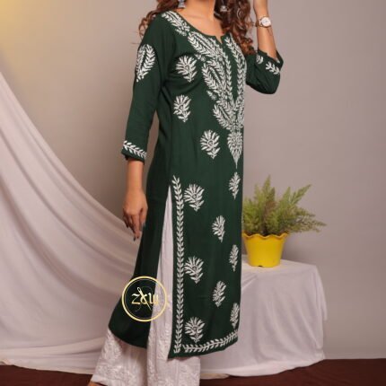 ZCW Rayon Chikankari Heavy Women’s Long Kurti – Bottle Green