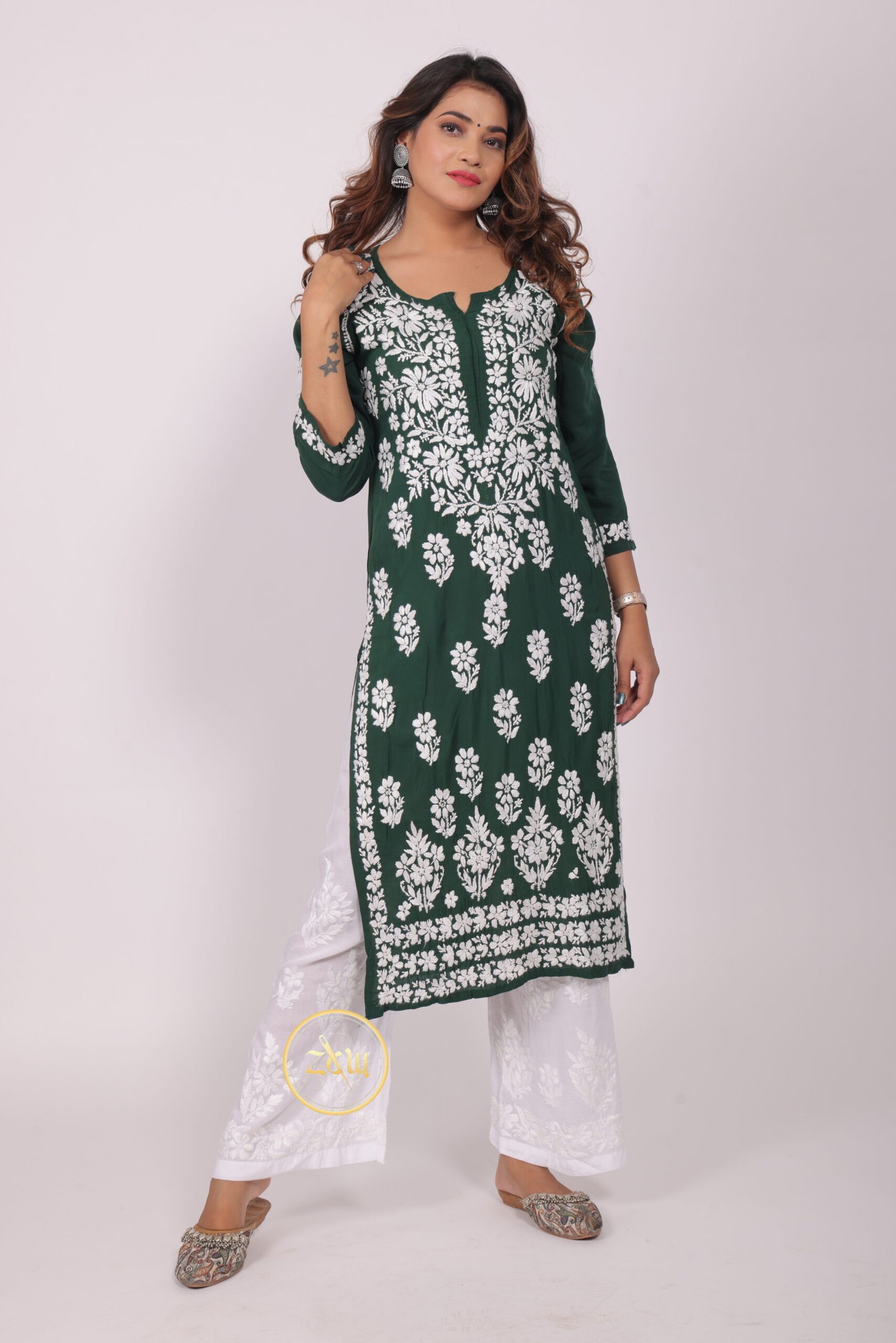 ZCW Modal Premium Chikankari Women’s Long Kurti – Bottle Green