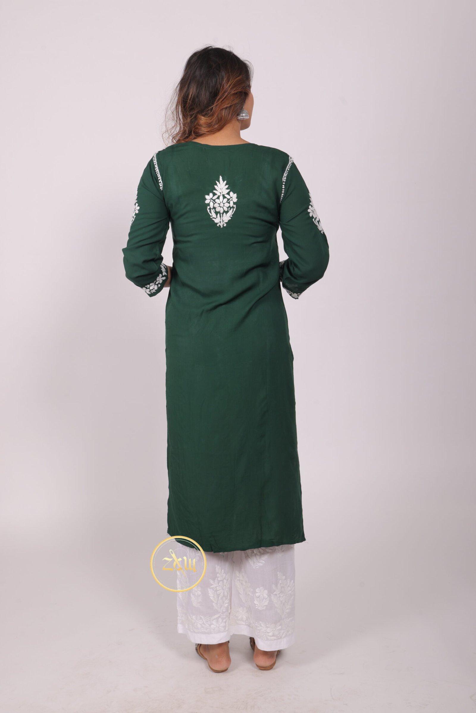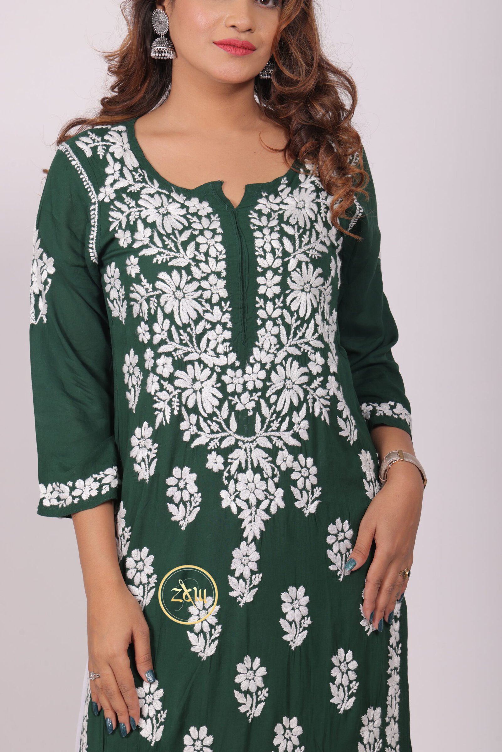 ZCW Modal Chikankari Women’s Long Kurti – Bottle Green