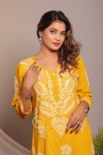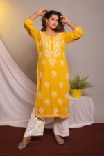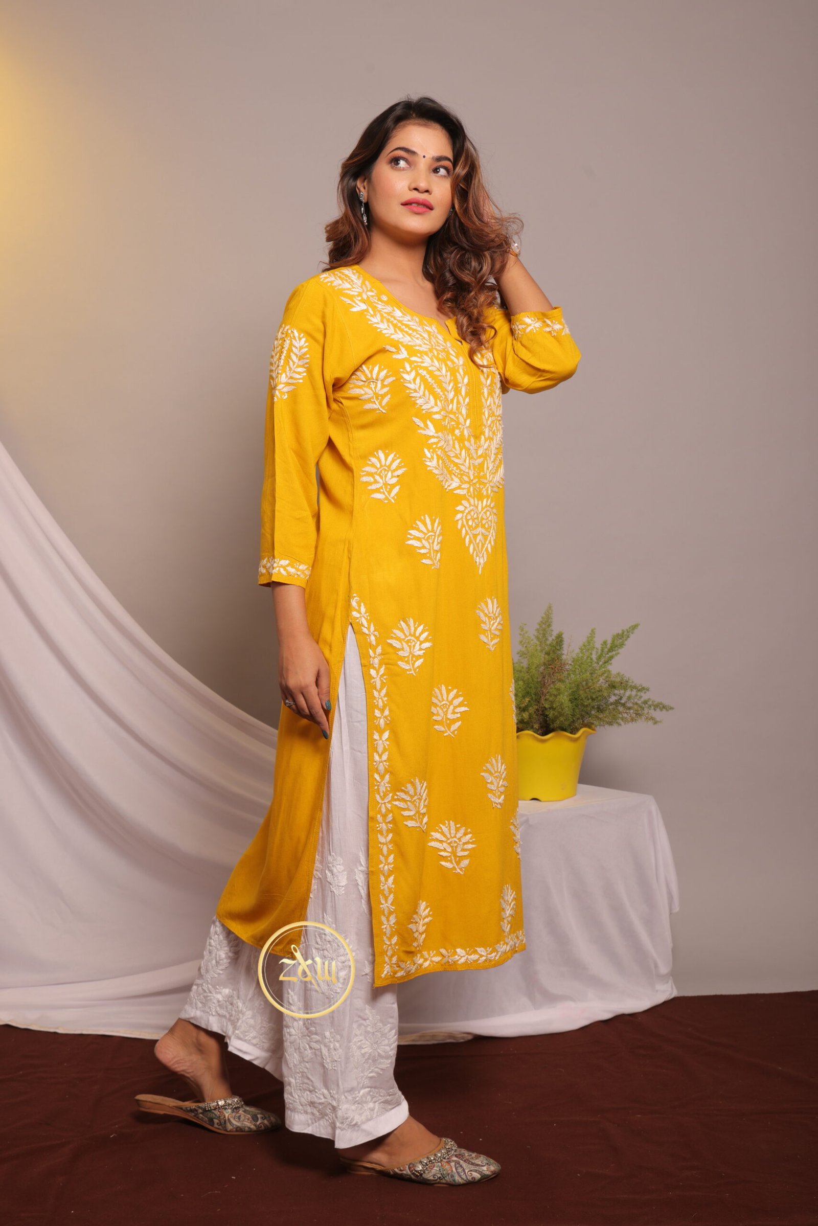 ZCW Rayon Chikankari Heavy Women’s Long Kurti – Mustard