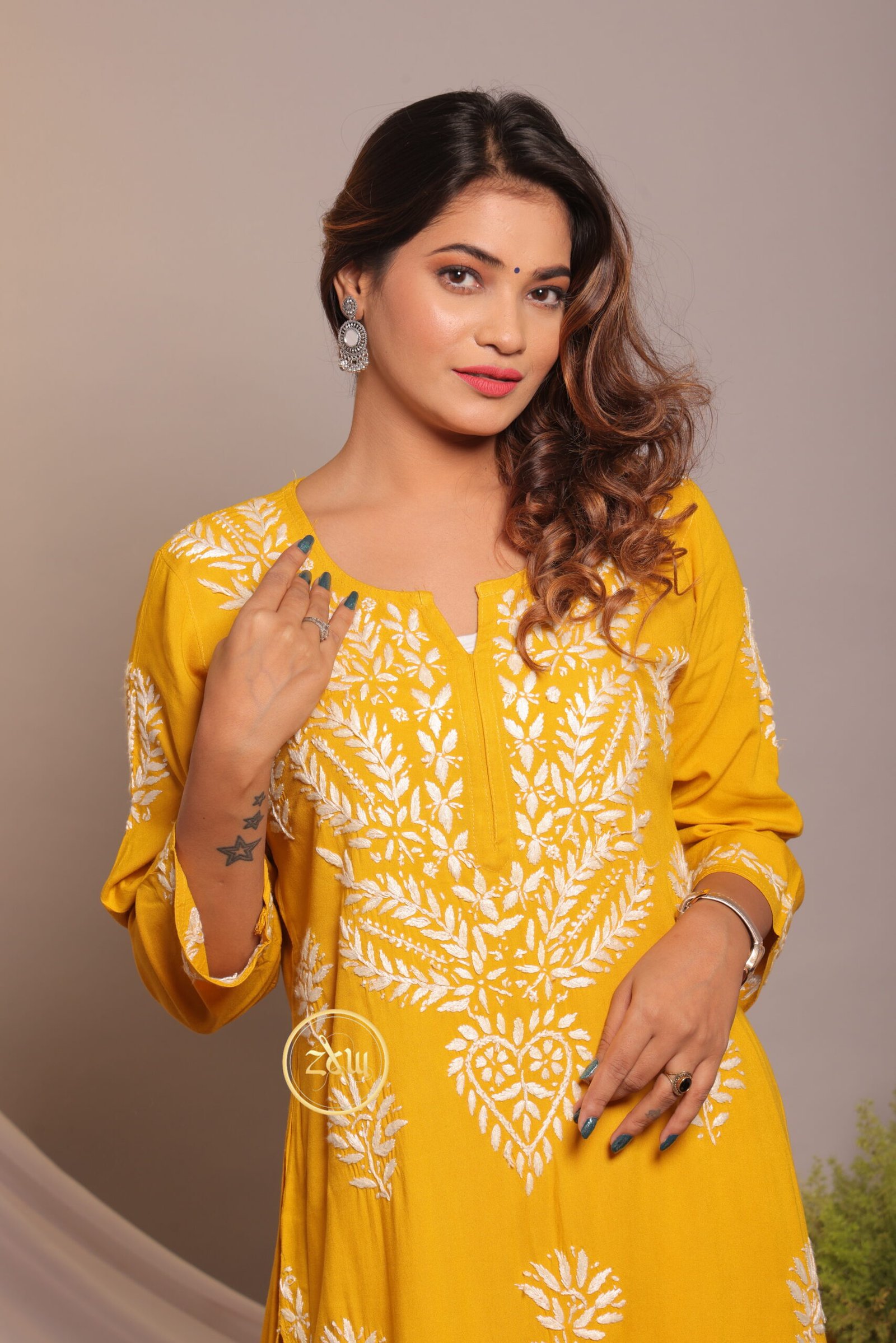 Home Product Fabric Rayon ZCW Rayon Chikankari Heavy Women’s Long Kurti – Mustard