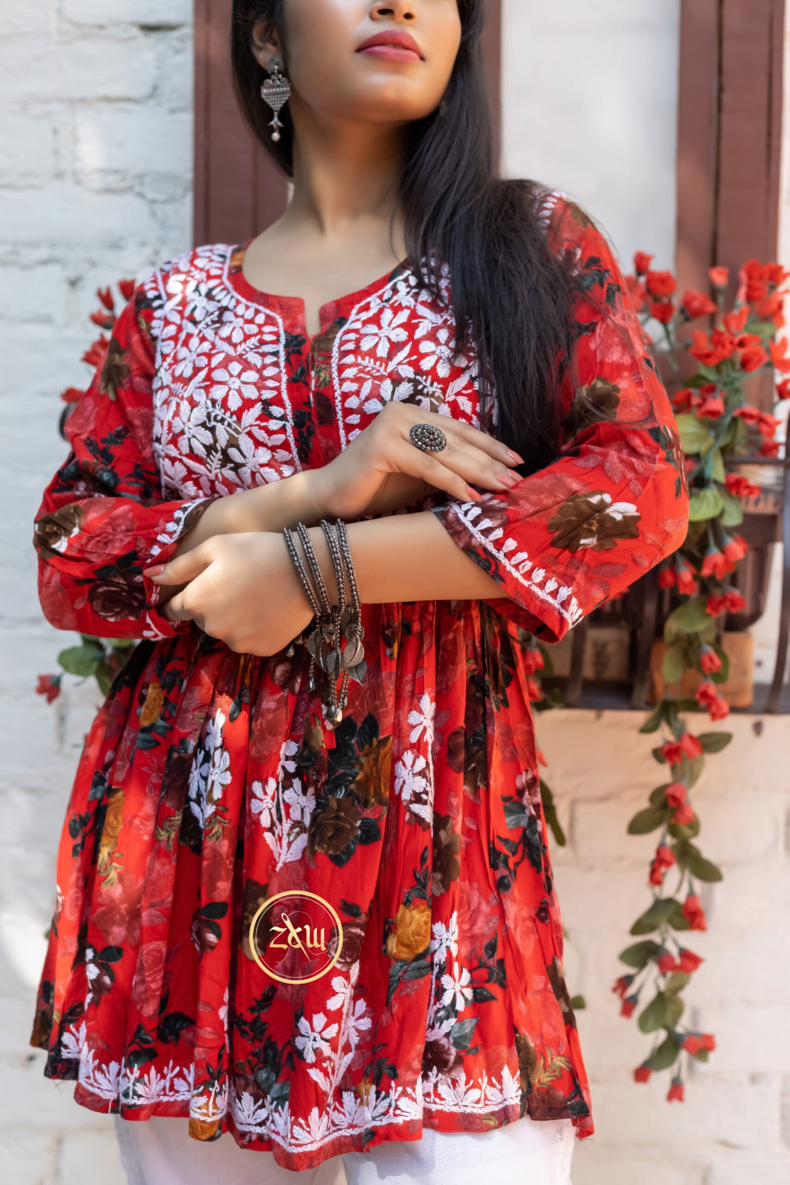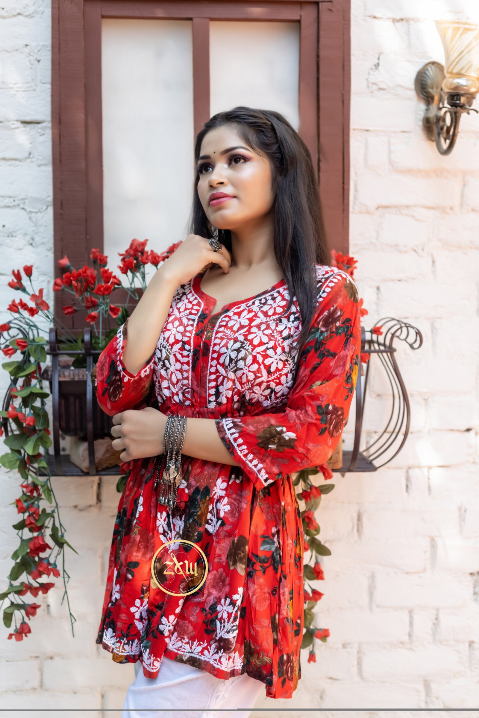 ZCW Rayon Printed Chikankari Short Gown 2PC Set – Red